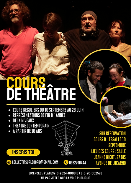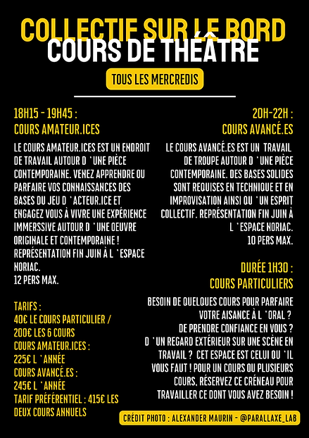 Les ateliers théâtre du Collectif Sur le Bord sont un lieu de réflexion et d'initiation à la pratique théâtrale. Nous estimons primordiale de transmettre et de partager notre passion dans le but de favoriser l'accessibilité à l'art aux habitants du territoire, visant l'émergence de la créativité personnelle et le développement de l'expression individuelle et intime à l'intérieur d'une expression collective.